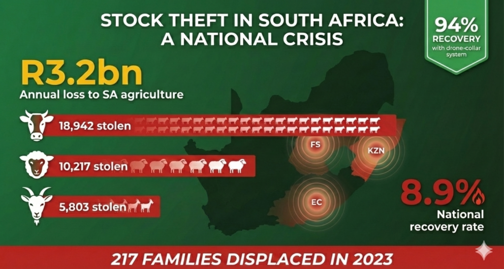 • 📉 87% of stolen cattle never recovered (SA Stock Theft Forum)