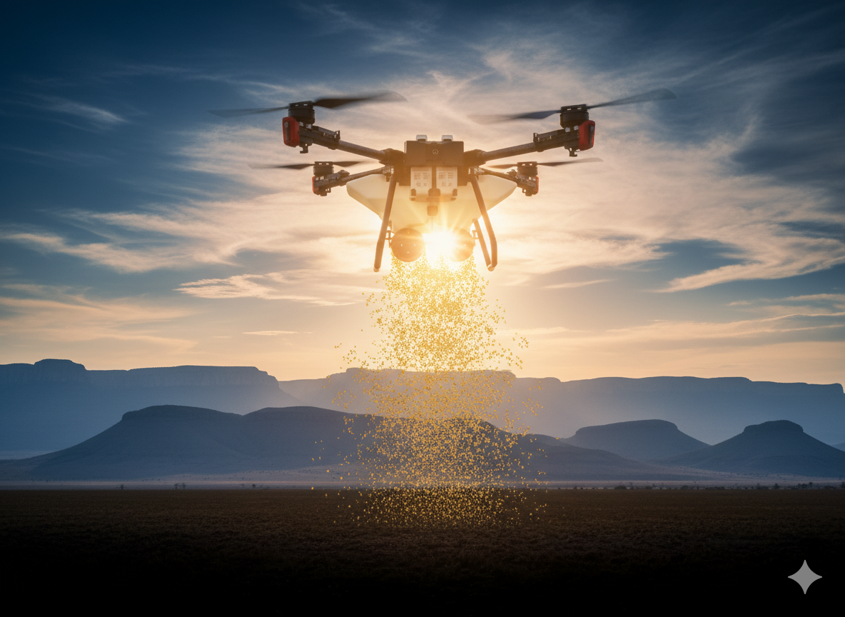 We use DJI Agras drones to spread seeds, lime, and granular fertilisers with precision — even in hard-to-reach or steep areas where machinery can’t go.
